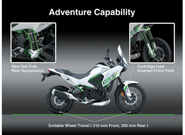 Specially designed for excellent performance across a wide range of riding situations, a KYB cartridge-type inverted front fork works with the New Uni-Trak rear suspension to deliver top-in-class wheel travel (210 mm front, 200 mm rear) and damping settings for good manners on the pavement and superb absorption off-road.