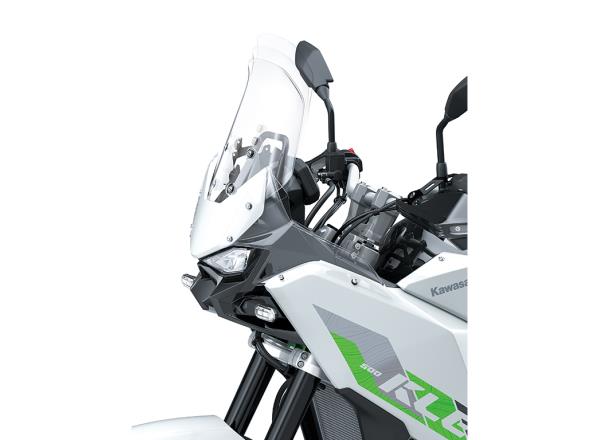 Key to the KLE500’s rally-inspired styling, the tall front cowl rises prominently at the front. The instrument panel’s angle presents a clear view to the rider even when standing, in the style of rally machines. Clear plastic panels surround the front cowl to enhance wind protection and give the front end a highly compact and functional appearance.